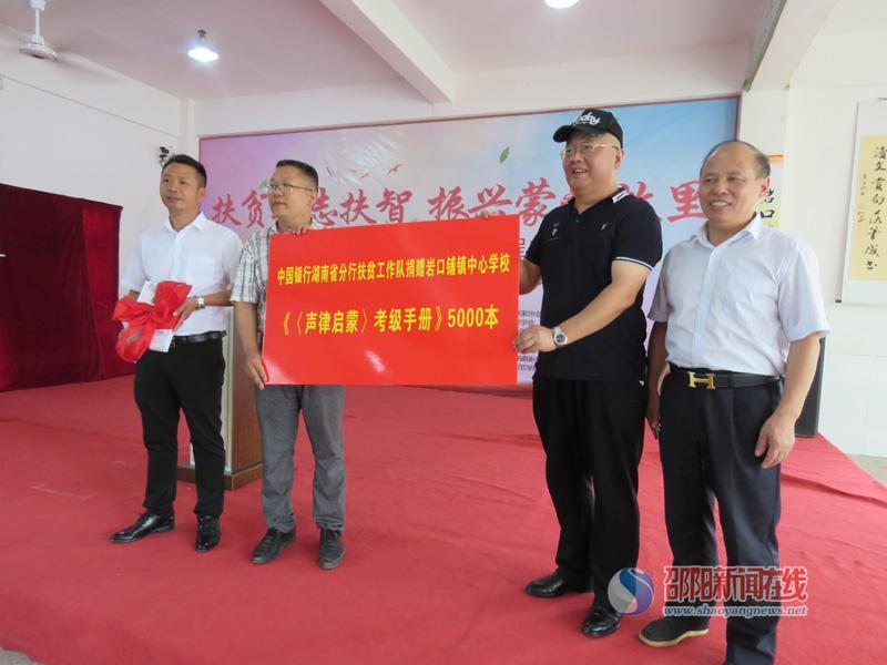 中国银行湖南省分行扶贫工作队(右)向岩口铺镇中心学校捐赠《<声律启蒙>诵读考级手册》