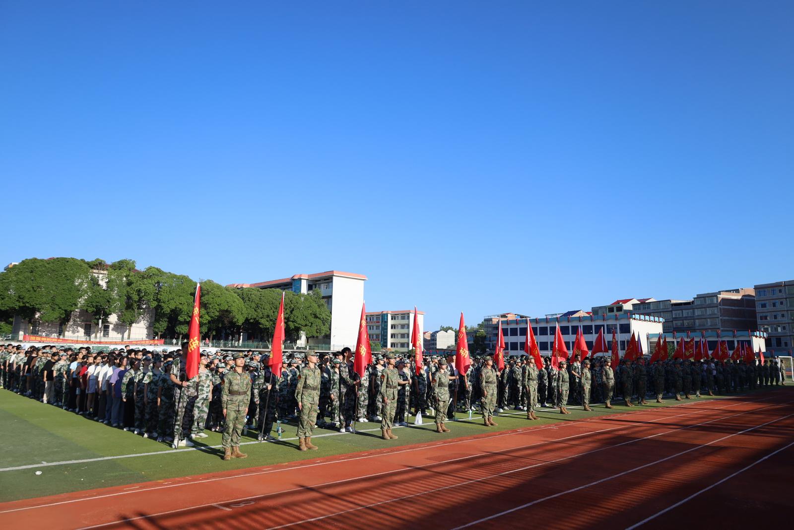 最后,申永富向军训团授旗,带队教官郑重接旗。飘扬的旗帜象征着军训任务的正式开启,也承载着学校对新生成长的殷切期望。