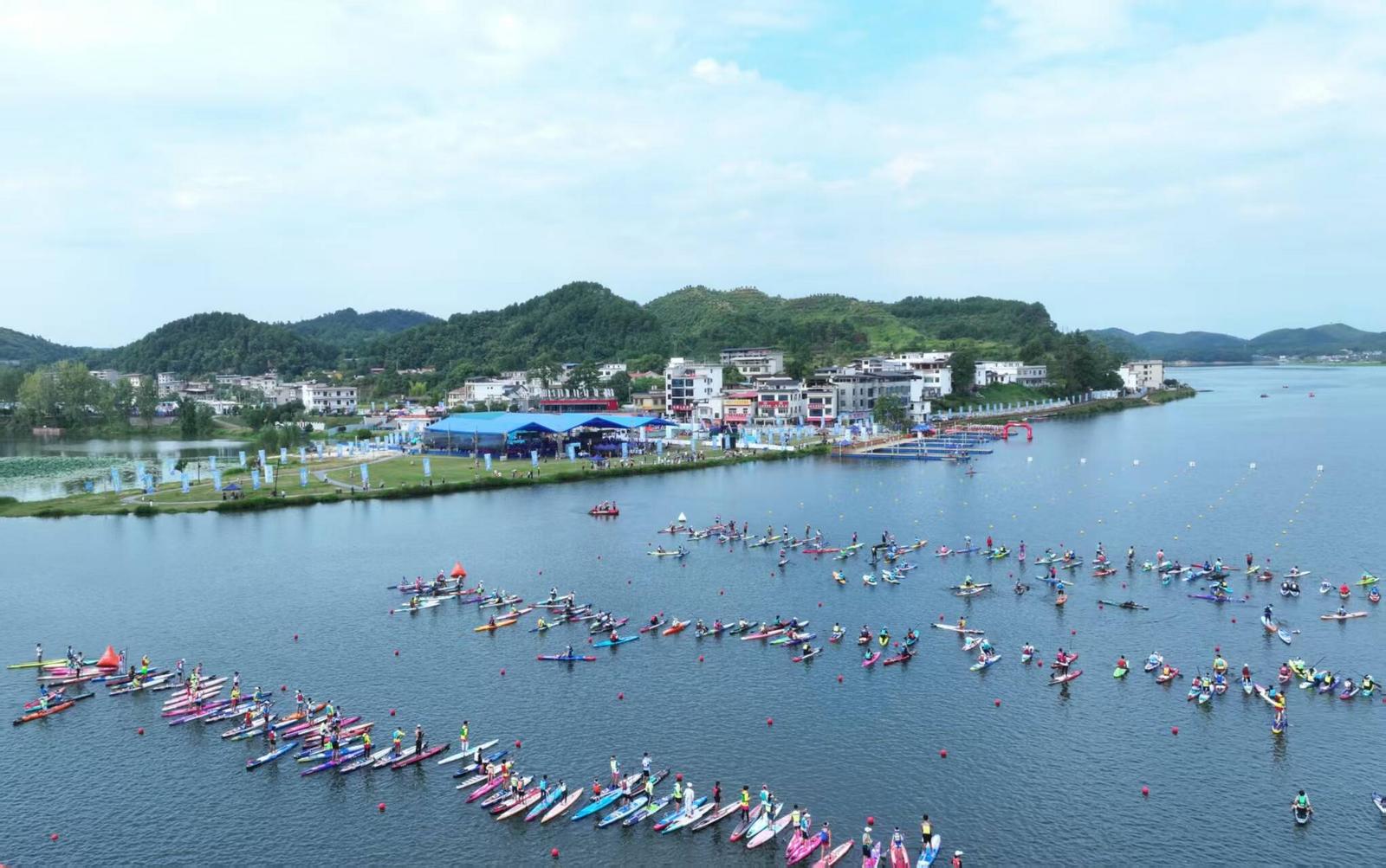 上午9时30分,参赛选手们站上桨板蓄势待发。随着一声响亮的鸣笛,选手们奋力挥桨,乘着五颜六色的桨板在宽阔的湖面御水前行、劈波斩浪,跃动了湖光。山与水的交融,动与静的交织,力与美的结合,激烈的赛事为广大游客奉上了一场精彩纷呈的水上运动盛宴。“天子湖非常适合桨板竞速,项目设置多元又区分了道次,赛事更具公平性。”来自江西景德镇的25岁选手严含燕谈到第4次到天子湖参赛的感受时说道。