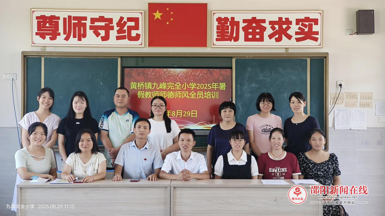 邵阳日报·邵阳新闻在线讯(通讯员 蒲丝丝)8月30日,洞口县黄桥镇九峰完全小学组织全体教师开展2025年暑假师德师风全员培训,以“弘扬教育家精神,争做新时代‘大先生’”为主题,全体教师共同参与学习,通过政策学习、榜样分享、主题引领等环节,为教师队伍注入育人新动能。