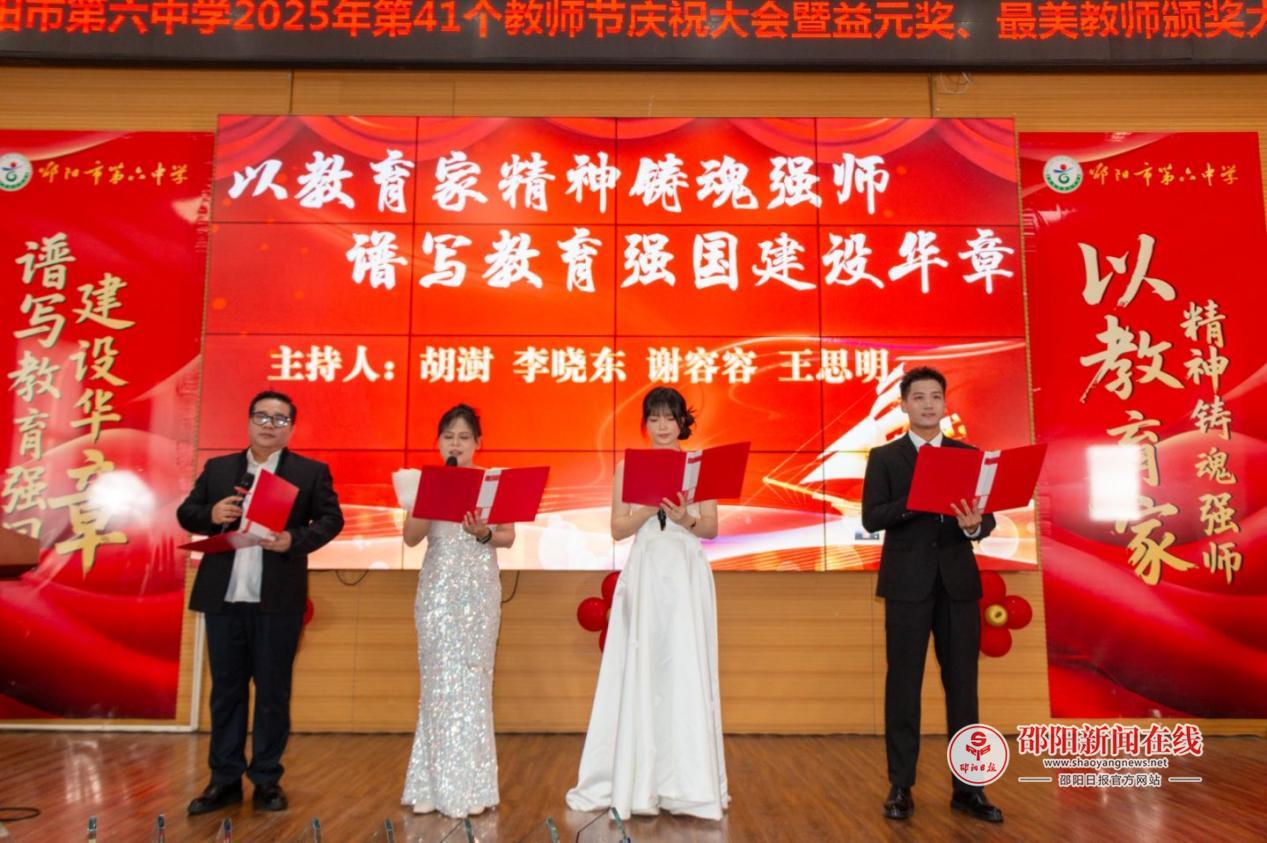 邵阳日报·邵阳新闻在线讯(通讯员 唐熹微 陈小宁)9 月 10 日下午 16 点,邵阳市第六中学在阶梯教室举行第 41 个教师节庆祝大会暨益元奖、最美教师颁奖大会,主题为 “以教育家精神铸魂强师,谱写教育强国建设华章”。