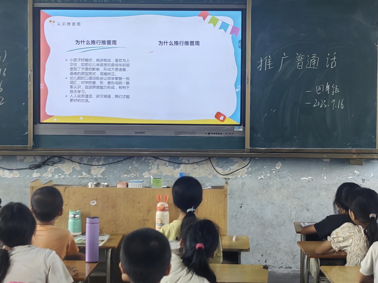 各班围绕“推普周”积极开展了一系列形式多样、精彩纷呈的活动。各年级利用班会时间举行相关的主题班会。活动从不同程度地促进了普通话的普及,更在同学们的心里埋下了说普通话、写规范字的种子,取得了一定的效果。此外,各班开展“推普”黑板报比赛、规范汉字书写大赛、社会不规范字纠错行动等一系列宣传活动。