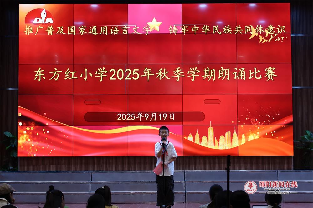 邵阳日报·邵阳新闻在线讯(通讯员 廖文胜 田野)9月19日上午,隆回县东方红小学多功能报告厅内洋溢着青春蓬勃的气息,以“推广普及国家通用语言文字·铸牢中华民族共同体意识”为主题的朗诵比赛在此举行,全校师生共同见证了一场融合语言之美与文化之魂的精神盛宴。