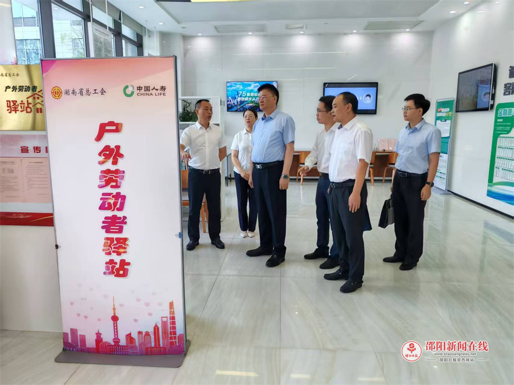 (中国人寿湖南省分公司党委书记、临时负责人黄胤立察看各地劳动者驿站情况。)