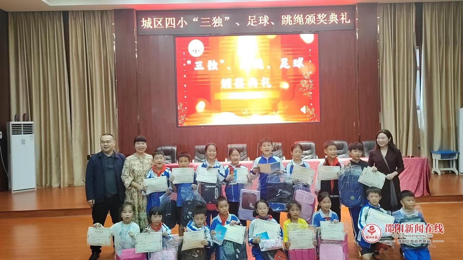 邵阳日报·邵阳新闻在线讯(通讯员 张建柱)9月24日,邵东城区四小举行了“三独”(独唱、独奏、独舞)、足球、跳绳比赛获奖学生颁奖典礼。学校党支部书记、校长、副校长、辅导老师共同出席,会议室内欢声笑语,气氛热烈,共同见证孩子们的荣耀时刻。