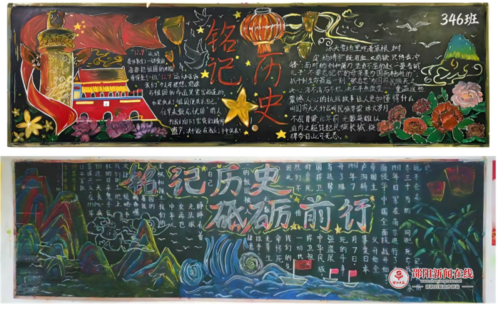 各班黑板上,斑斓色彩冲击视觉,澎湃激情震撼心灵。金光熠熠的五星红旗与五角星辉映主题,巍峨的长城与庄严的天安门诉说千年历史;振翅高飞的和平鸽与翱翔九州的凤凰,象征对美好未来的无限憧憬;坚毅的军人与嘹亮的号角,则唤醒那段烽火连天的峥嵘岁月。那铮铮作响的宣言、动人的英雄事迹以及那催人奋进的语录,都是历史的回响,是时代的注脚。学生们巧妙构思,将历史厚重与青春奋发熔于一炉,既有对过往最深切的缅怀,亦有对未来最炽热的展望。
