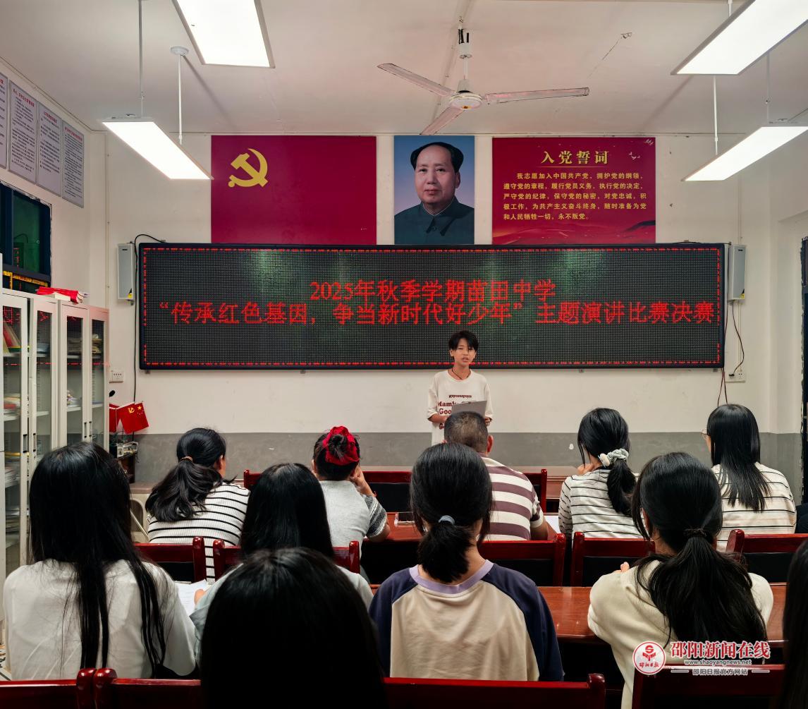 邵阳日报·邵阳新闻在线讯(通讯员 刘玄英 阳婷)9月29日,隆回县鸭田镇苗田中学举行“传承红色基因,争当新时代好少年”主题演讲比赛决赛。来自各班级的12名选手参与角逐,展现对红色历史的崇敬与青春朝气。