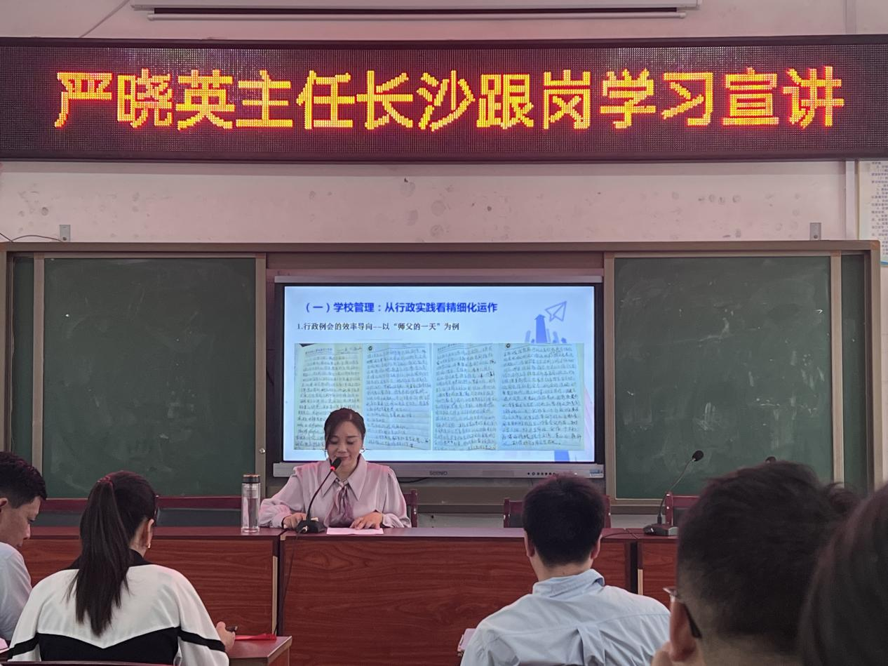 活动前夕,山门镇中学高度重视,全体青年行政管理人员、教科室成员、英语组教师及本学期新进教师均积极参与,展现出虚心学习和追求创新的良好氛围。严晓英主任作为主讲人,详细介绍了湖南师范大学附属滨江学校教育的前沿理念与实践经验,为与会教师带来了一场思想盛宴。严晓英主任的心得分享多层次、密结构,从行政管理到日常教学,以图文、视频、举例讲解的形式呈现了一堂内容丰富、受益匪浅的分享会。