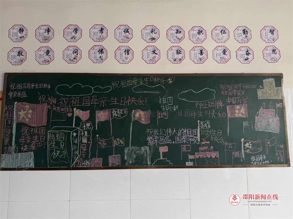 各班黑板上,“庆国庆”主题板报图文并茂,鲜红底色与金黄图案相映,成为校园里的亮眼风景。活动中,师生还共同观看红色短片,在历史场景中感悟今日幸福生活的来之不易。