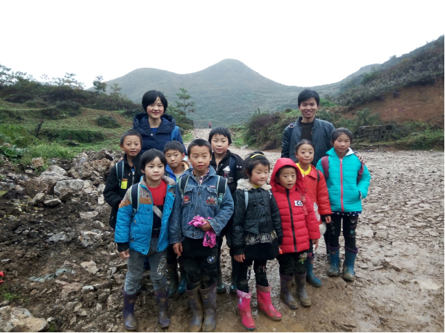 侯长亮(后右)和妻子雷宇丹在云南昭通支教。