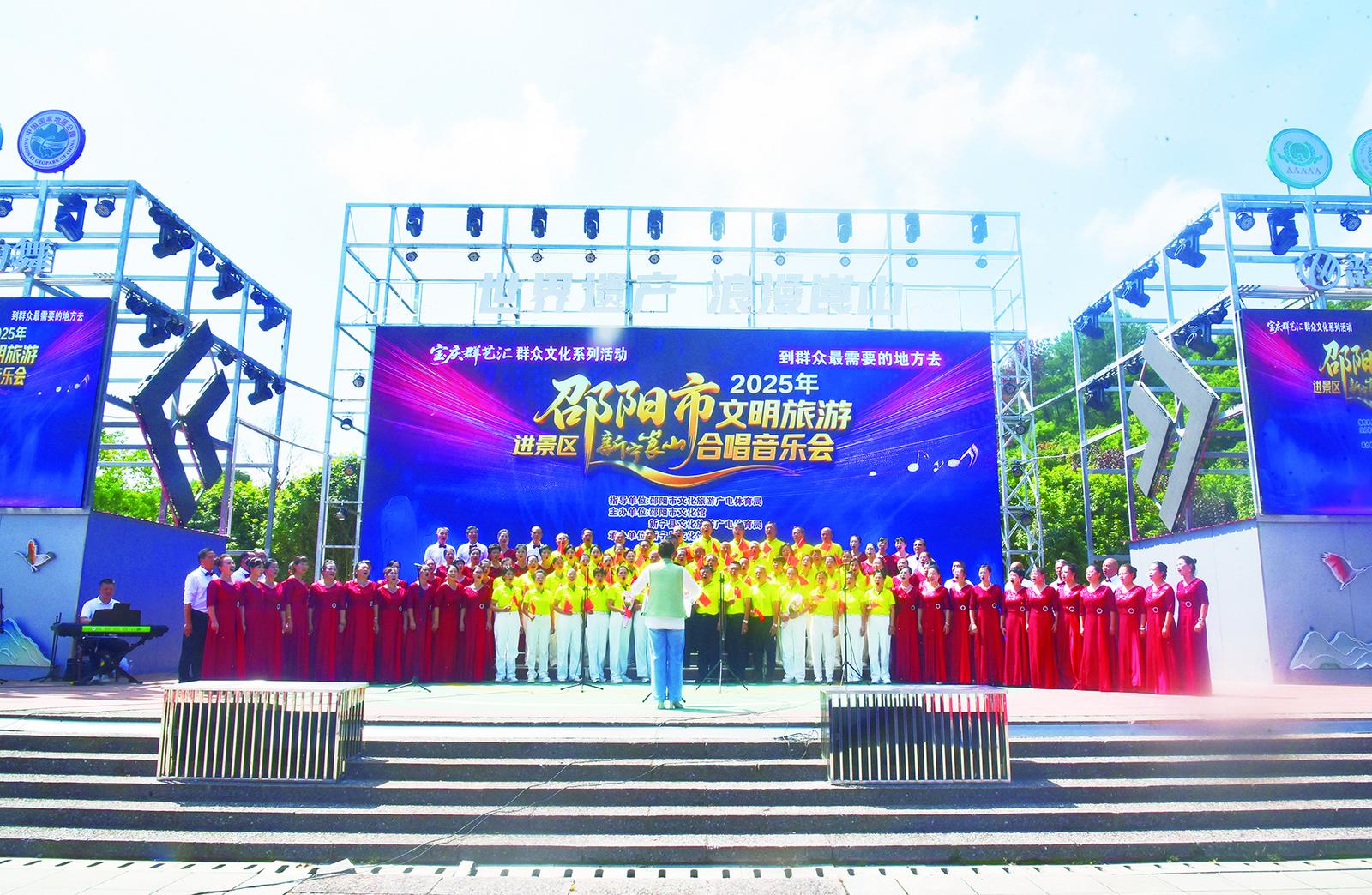 清晨的崀山景区北大门外广场歌声回荡。邵阳市文化馆爱莲合唱团与新宁县群文俱乐部联袂献上2025年邵阳市文明旅游进景区(新宁崀山)合唱音乐会。演出精选了一批跨时代、多风格的合唱作品:《绣红旗》《十送红军》《壮美延安》等经典红歌带领观众回顾峥嵘岁月,传递红色信念;《崀山脐橙香》扎根本土,旋律悠扬,描绘出邵阳的乡土画卷;《世界赠与我的》等现代流行改编作品则唱出时代新声。不同歌声交织,既回望历史,也凝聚起团结奋进、迈向新征程的精神力量,为景区增添了浓郁的文化气息。