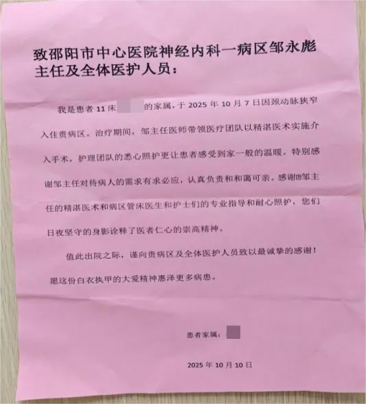 邵阳日报·邵阳新闻在线讯(通讯员 林海英)10月10日,神经内科一区收到了一封感谢信,来自一位因颈动脉狭窄进行了支架置入术的患者。患者从入院检查到完成手术康复出院仅用时三天,邵阳市中心医院神经内科介入团队让患者体验到了“微创手术+快速康复”的惊喜。