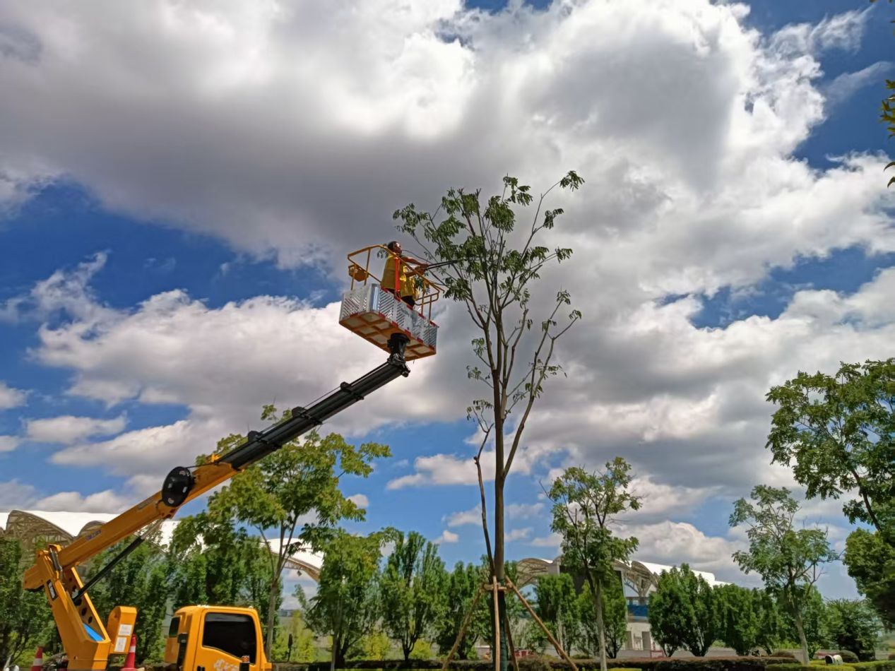 ▶园林工人在市体育中心旁进行高空作业,修剪树枝。