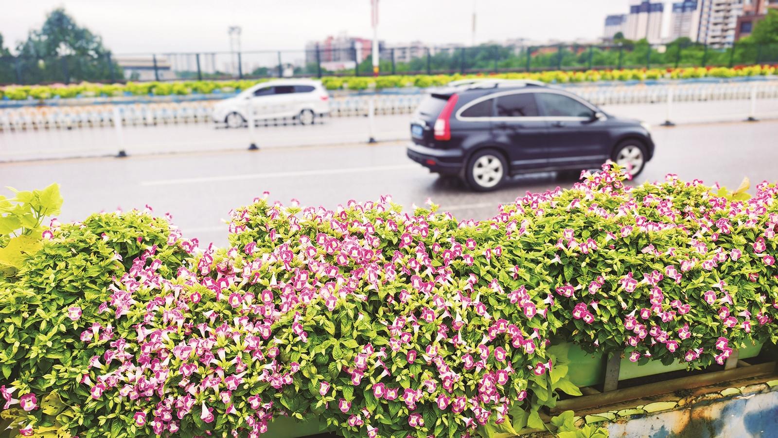 西湖南路旁道路花箱里的矮牵牛竞相绽放。