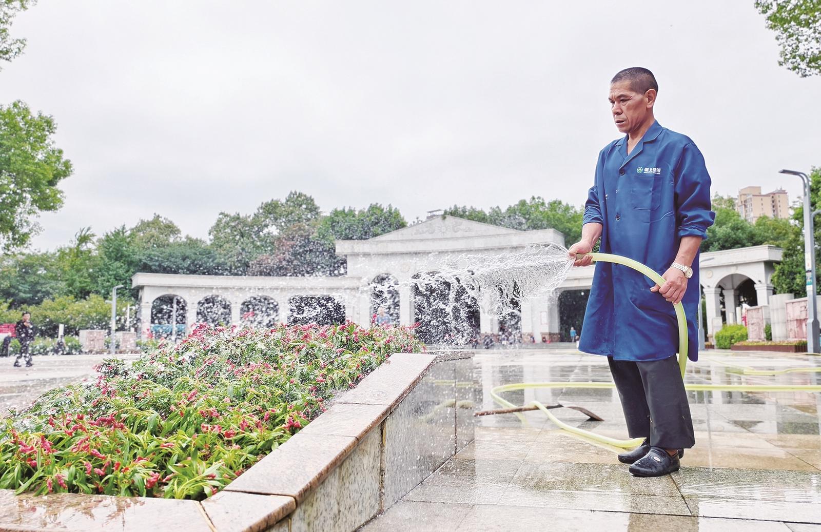 ▶城南公园广场,工人给栽种后的花卉浇水。