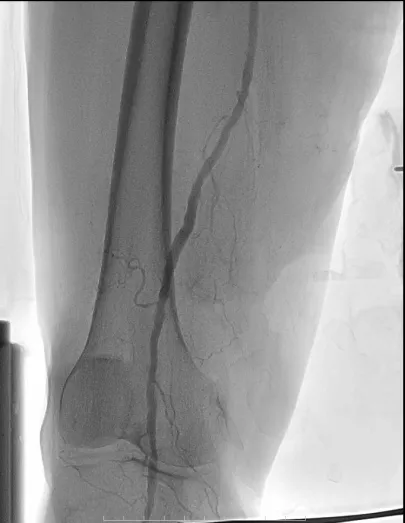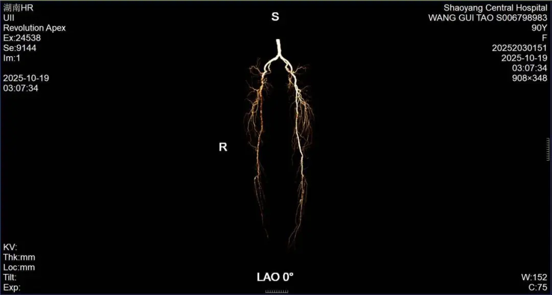 “时间就是肌肉,时间就是肢体,但保住生命是首要前提!”面对这位超高龄、心功能储备极差、基础疾病复杂的患者,介入血管外科刘林志主任团队立即启动血管急症救治绿色通道。下肢动脉CT血管成像(CTA)检查结果证实了专家的判断:右股动脉近段完全闭塞。