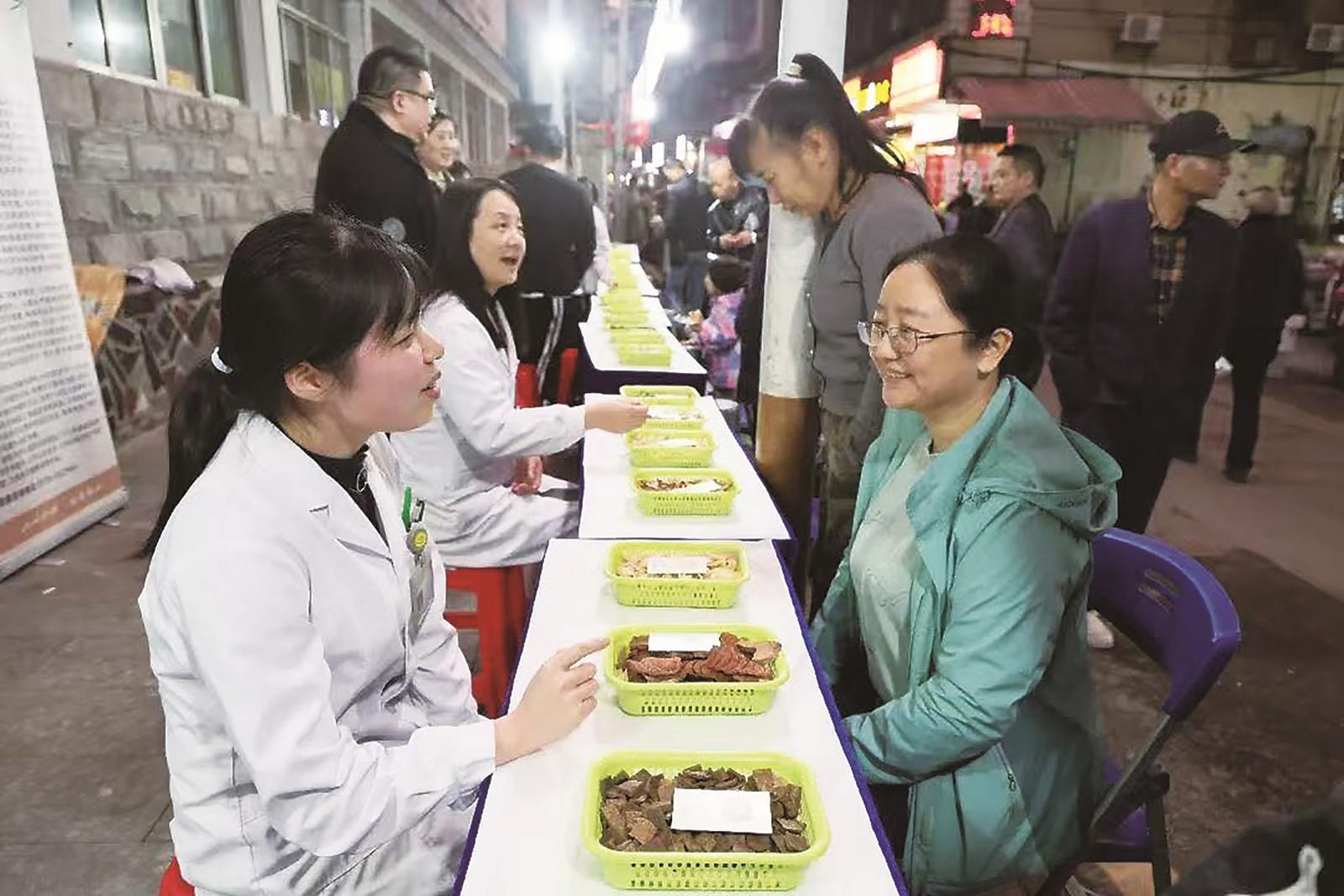 夜幕初垂,夜市已热闹非凡。中医义诊区人气最旺,一字排开的诊台前,来自市中心医院中医科、肿瘤科、乳甲外科、生殖中心等科室的骨干医师,以及省肿瘤医院的帮扶专家共同坐镇,专注接诊。