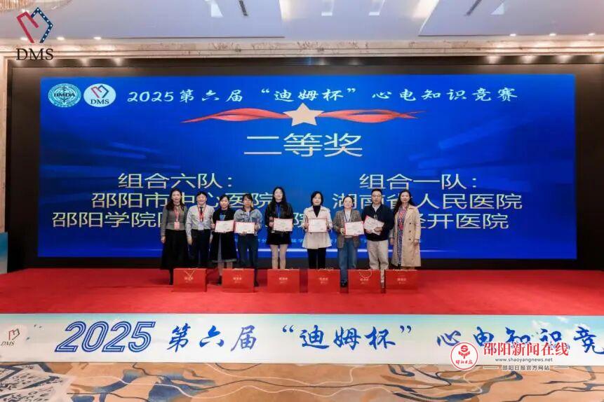 为促进湖南省各地区医师之间的学术交流与经验分享,同期举办了2025年疑难心律失常诊断联盟“迪姆杯”心电知识大赛。本次大赛共有来自全省的23支队伍参加。在我院心电中心科主任周静的带领下,马婧副主任医师和张国秋主治医师积极参赛、发挥出色,经过激烈角逐,最终荣获二等奖(总排名第二名)。